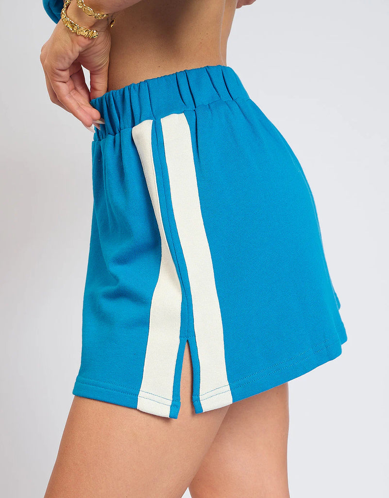 The Maya Mini Skirt is designed with a soft elastic waistband and detailed side stripes. Pair back with the Mason Tee in Chilli.